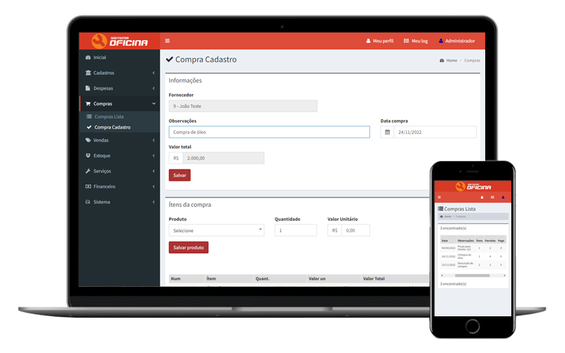 A compra está integrada com o financeiro, pode indicar os produtos que está realizando a compra, forma de pagamento e parcelamento. Relatório de compras por período, por produto e por fornecedor.